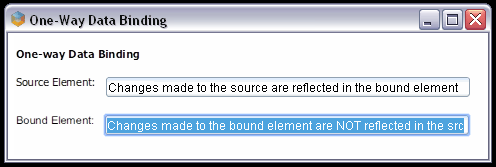 The bound element is also an input gadget; it contains the child binding element, which binds the parent to the source identified in the elementSource attribute. The targetProperty attribute indicates which property of the bound element should be updated when a change occurs, and the path attribute indicates the property of the source element to use in the update. The method attribute indicates whether the binding is one-way or two-way. With two-way binding, changes made to the source are reflected in bound boxes, and changes made to a bound box are reflected in the source.